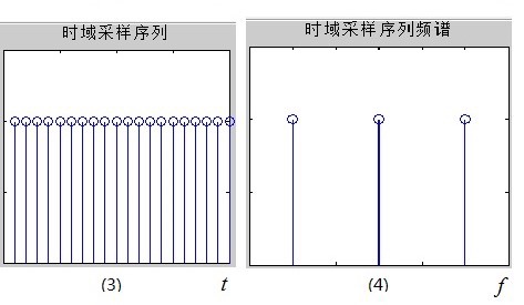 但是,计算机只能处理数字信号,首先需要将原模拟信号在时域离散化,即在时域对其进行采样,采样脉冲序列如图(3)所示,该采样序列的频谱如图(4),可见它的频谱也是一系列的脉冲。