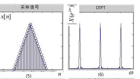 所谓时域采样,就是在时域对信号进行相乘,(1)×(3)后可以得到离散时间信号$x[n]$,如图(5)所示;由前面的性质1,时域的相乘相当于频域的卷积,那么,图(2)与图(4)进行卷积,根据前面的性质2知,会在各个脉冲点处出现镜像,于是得到图(6),它就是图(5)所示离散时间信号$x[n]$ 的 DTFT(Discrete time Fourier Transform),即离散时间傅立叶变换,这里强调的是“离散时间”四个字。