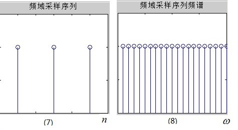 经过上面两个步骤,我们得到的信号依然不能被计算机处理,因为频域既连续,又周期。我们自然就想到,既然时域可以采样,为什么频域不能采样呢?这样不就时域与频域都离散化了吗?没错,接下来对频域在进行采样,频域采样信号的频谱如图(8)所示,它的时域波形如图(7)。