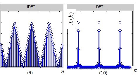 现在我们进行频域采样,即频域相乘,图(6)×图(8)得到图(10),那么根据性质1,这次是频域相乘,时域卷积了吧,图(5)和图(7)卷积得到图(9),不出所料的,镜像会呈周期性出现在各个脉冲点处。我们取图(10)周期序列的主值区间,并记为X(k),它就是序列 $x[n]$ 的DFT(Discrete Fourier Transform),即离散傅立叶变换。