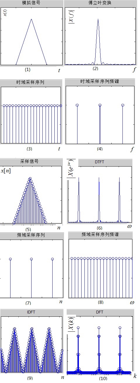 可见,DFT只是为了计算机处理方便,在频率域对DTFT进行的采样并截取主值而已。有人可能疑惑,对图(10)进行IDFT,回到时域即图(9),它与原离散信号图(5)所示的 $x[n]$ 不同呀,它是 $x[n]$ 的周期性延拓!没错,因此你去查找一个IDFT的定义式,是不是对n的取值区间进行限制了呢?这一限制的含义就是,取该周期延拓序列的主值区间,即可还原 $x[n]$